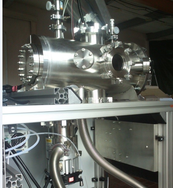 • Конструктивно установка вакуумного напыления выполнена в виде кубической вакуумной камеры, установленной на монтажной раме. Отдельно установлена стандартная 19-ти дюймовая телекоммуникационная стойка с источниками питания, контроллерами и управляющим компьютером, а также чиллер охлаждения