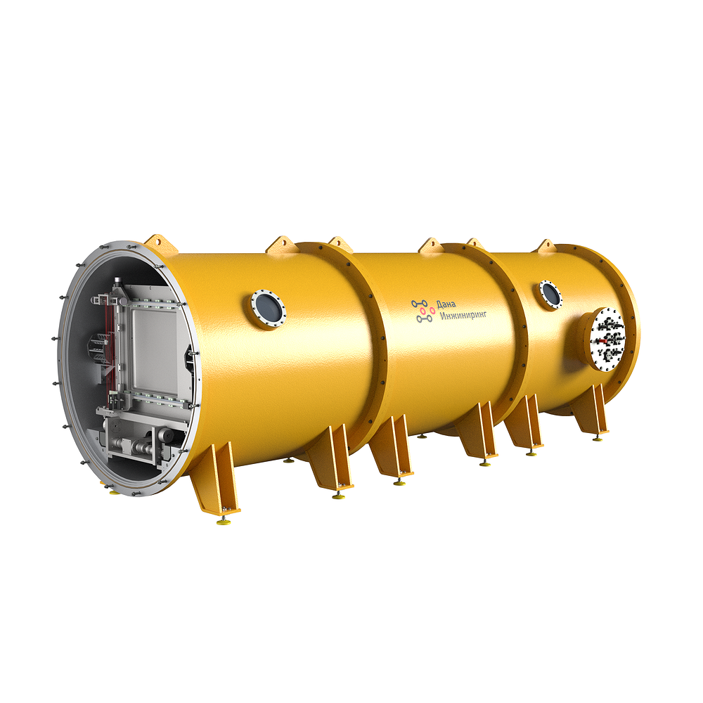 Горизонтально-цилиндрическая вакуумная камера с откидной крышкой на телеге с электроприводом
