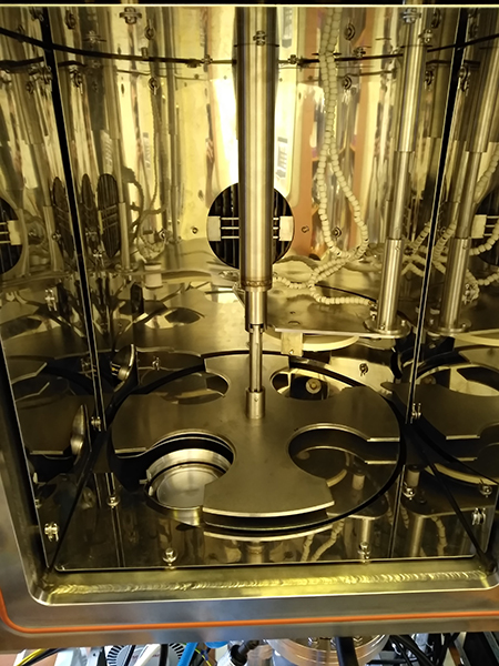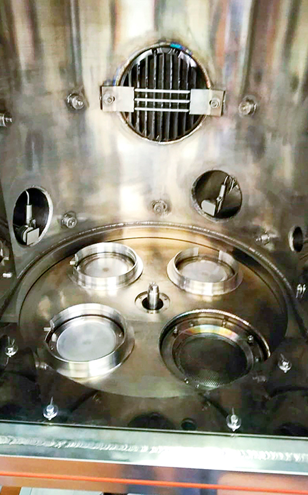 На вакуумной камере установлена дверь загрузки/выгрузки и обслуживания технологических устройств. Подложки устанавливаются в горизонтально расположенный карусельный подложкодержатель – реализована схема напыления «снизу вверх».