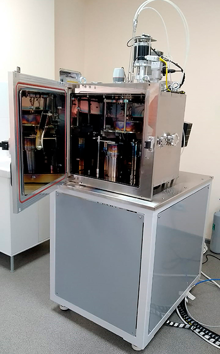 Вакуумная камера герметично пристыкована к перчаточному боксу таким образом, что загрузка/выгрузка подложек осуществляется без разгерметизации на атмосферу. Также вакуумная камера имеет дверь сервисного обслуживания технологических устройств, которая открывается на атмосферу. Подложки устанавливаются в горизонтально расположенный термостатируемый подложкодержатель – реализована схема напыления «снизу вверх».